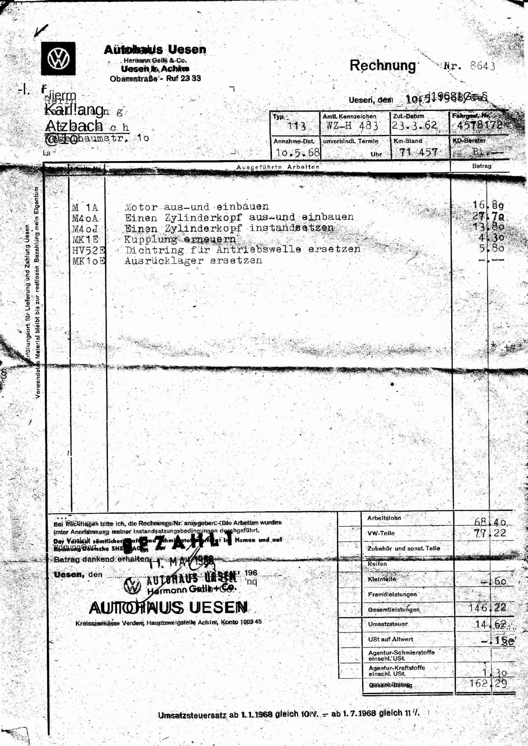 Hier ist er, der VW-Käfer in Aktion! Was für ein Kaufkraftverlust in 52 Jahren! Da hat meine Schwester tatsächlich eine historische Autoreparaturrechnung gefunden! Bei der Auflistung der Einzelposten spätestens kriegt man Tränen in die Augen! Ist dem Deutschen sein Herzblatt, sein Liebstes, das…