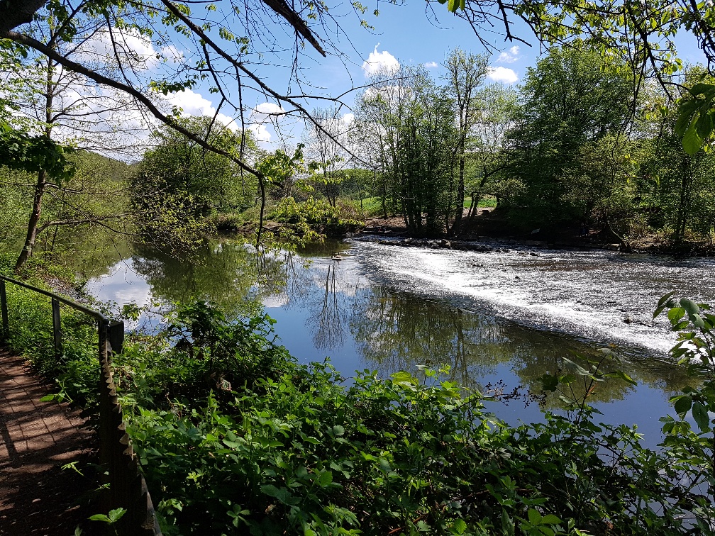 Wir folgen dem Wanderweg, der uns über viele gewundene innerörtliche Straßen durch den idyllischen bergischen Ortskern an einer Eisdiele und der Evangelischen Kirche vorbei zum Wupperufer bringt. Dem Uferweg folgen wir zurück bis zum Eicherhofpark. Hier genießen wir an einer halbkreisförmigen Sitzgruppe noch eine gute halbe Stunde die Ruhe. Dann ziehen langsam Wolken auf. Unser Ziel haben wir ja schon erreicht! Ein schöner Wandertag!