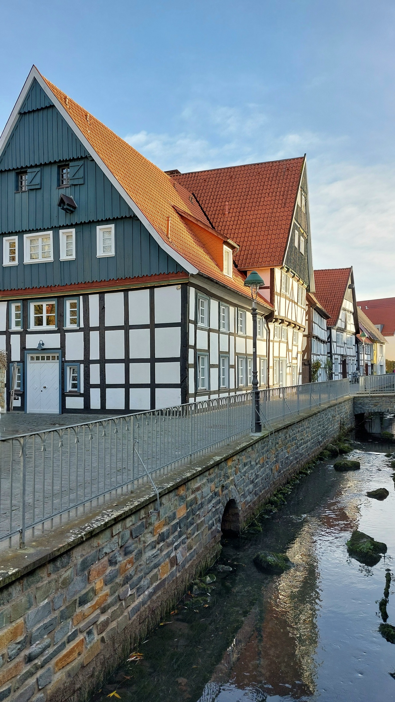 Wir treffen auf die Schwarzenborngasse und gehen nach rechts über eine Brücke in Richtung Theodor-Heuss-Park. Doch zuvor statten wir dem Restaurant Solista einen Besuch ab. Eine schöne Lage ist das hier, mit Aussicht auf den Mühlenteich, den Park mit Spielplatz, die Altstadt und hohe Bäume, zudem die architektonische Gestaltung bemerkenswert ist.